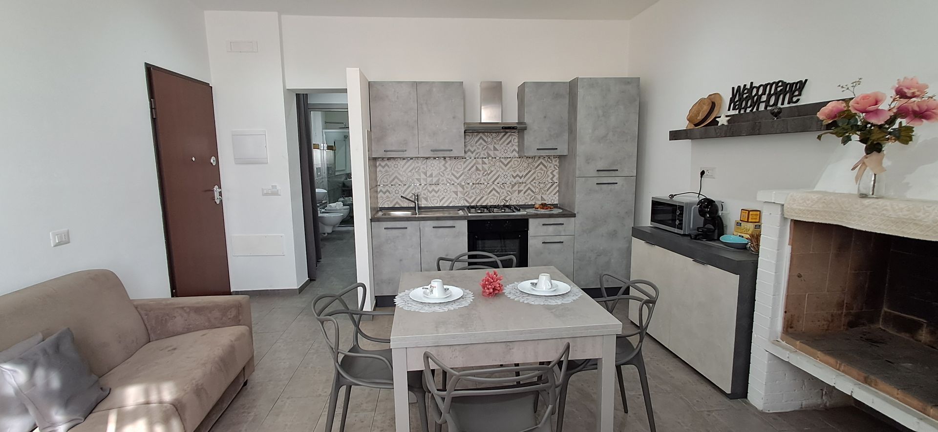 A Casa da Mondo è un appartamento ristrutturato nel centro di Olbia, arredato per garantire comfort e funzionalità. L’ingresso conduce in un soggiorno luminoso, caratterizzato da un divano letto e da un caminetto che aggiunge un elemento distintivo all’ambiente. L’angolo cottura è completamente attrezzato con stoviglie e dotazioni utili per preparare i pasti in autonomia.